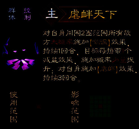 对自身周围2圈范围所有敌方大概率施加【嘲讽】效果持续1回合,目标每携带1个减益效果,施加概率少量提升:对自身施加【虐衅】效果持续3回合