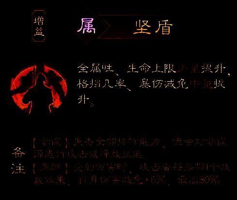 全属性生命上限少量提升,格挡几率和暴伤减免中量提升。