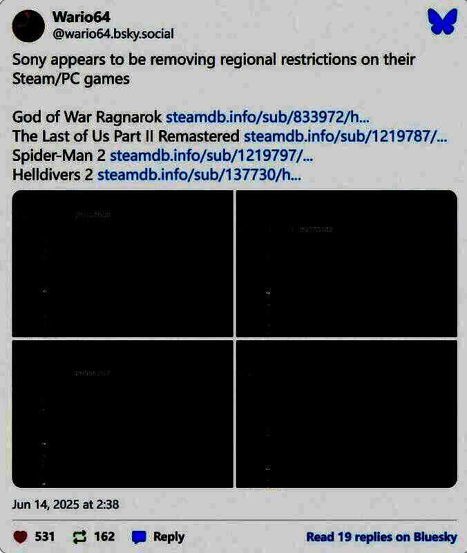 然而随着《剑星》的成功,索尼终于“开窍了”。索尼已经为旗下大多数移植到PC的游戏取消了区域购买限制。像是《漫威蜘蛛侠2》、《战神5》、《绝地潜兵2》、《最后的生还者2:重制版》等等,现在绝大多数地区的玩家都能在Steam购买了。