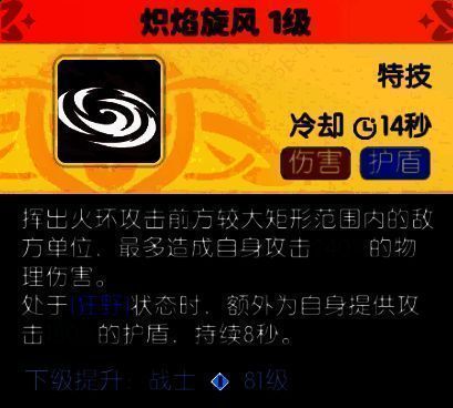 特技:炽焰旋风对范围内敌人造成AOE物理伤害,【狂野】状态下额外提供护盾。