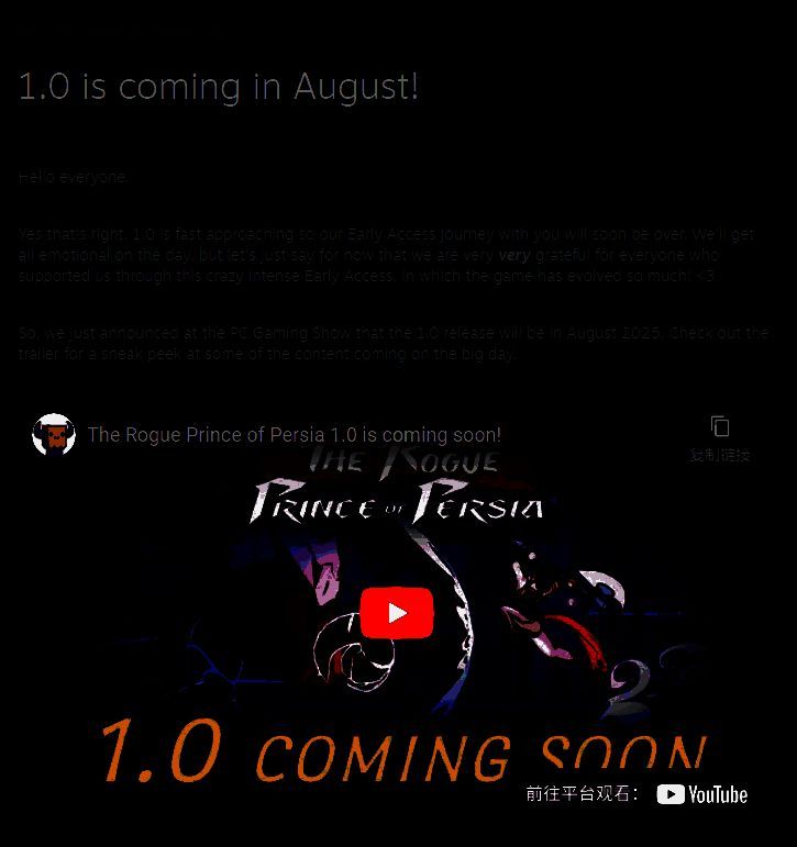 Evil Empire补充道:我们在PC游戏展上刚刚宣布,正式版将于2025年8月发布。最新预告片里已经剧透了部分重磅更新内容:首先当然是补完故事主线,我们将在与遗忘之塔、圣殿同阶段的关卡新增一个生态区域,同时追加最终关卡场景以及终极BOSS战——臭名昭著的诺盖国王。第三幕剧情将揭晓真正结局,您终于能见到王子那位神秘的父亲——波斯帝国的君王。