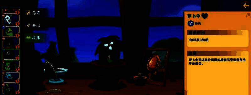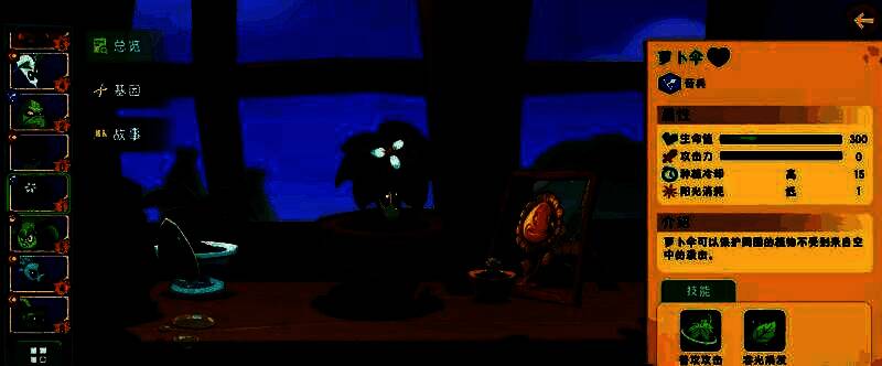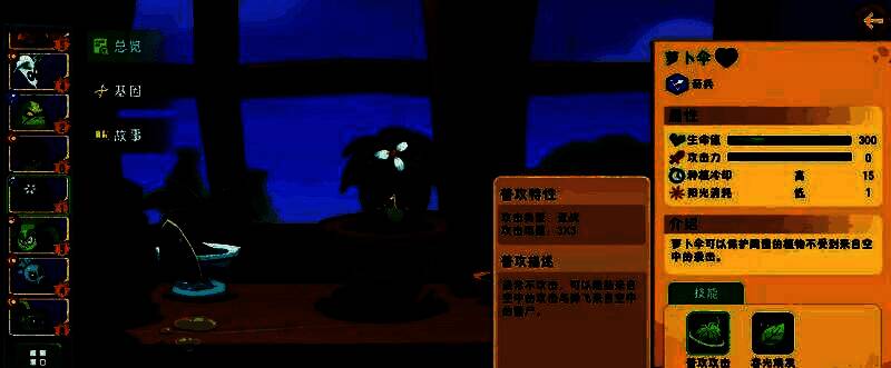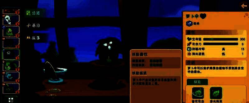 萝卜伞曾经是一个胆小鬼,直到它找到自己的使命守护之后,现在已经成为了可以保护植物们的好大哥。当玩家在通关城区第6关之后,就可以获得萝卜伞这个植物。需要消耗1点阳光,种植冷却时间比较长,生命值较低。它的能力是可以保护周围的植物不受到来自空中的袭击。通过这个技能效果特点不难看出,这个植物还是有着很关键作用的。因为在游戏中并不是完全的地面战斗,很多时候要面对来自各个方面的攻击,空中攻击也是一类。