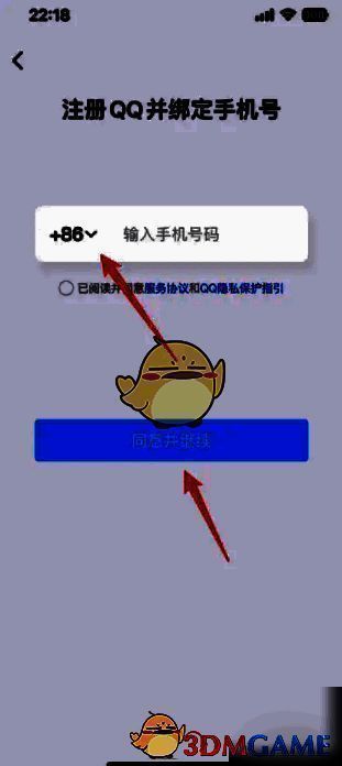 4、进入到注册QQ并绑定手机号窗口,输入手机号码,点击【同意并继续】,按照提示进行注册小号。