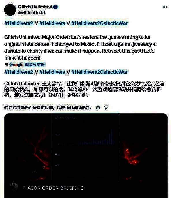 知名内容创作者Glitch Unlimited在推特发起请愿,承诺若能在6月31日前将近期评价拉回“好评”,将举办游戏抽奖并捐赠慈善机构。这场行动特别呼吁享受过“民主之心”更新(带来50%玩家数增长)的忠实玩家参与。