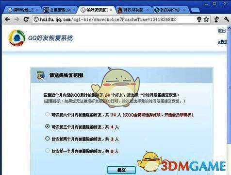 2、选择一个时间范围,提交恢复。非QQ会员可以选择恢复一个月、二个月及三个月内被删除的好友,QQ会员可以恢复六个月内被删除的好友。