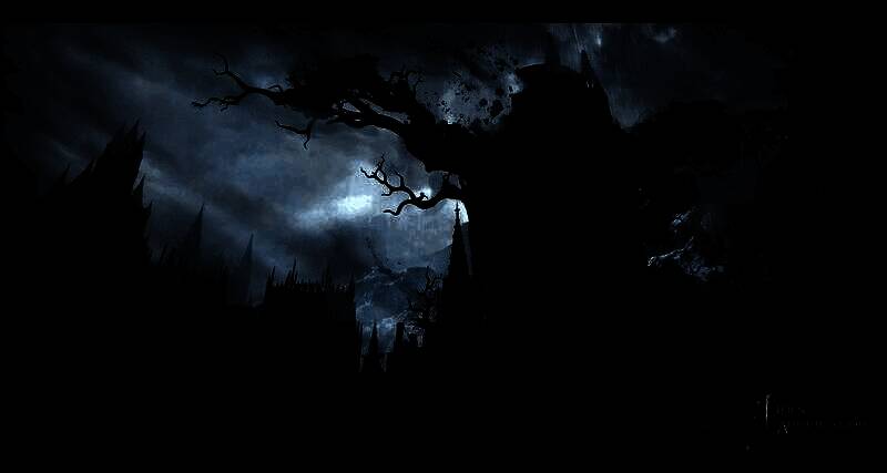 艺术图展示了一棵枯树与古堡共生,根系与建筑交织,盘踞在山峦之间。背后哥特式建筑群若隐若现,而女主傲然站立在枯树古堡前。