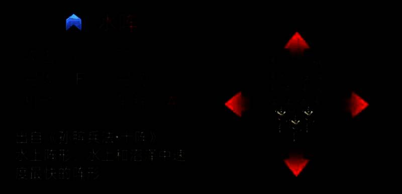 特点:不会陷入沼泽、水上和沼泽上移动最快且武将属性不会像其他阵型一样在水上受到削弱。