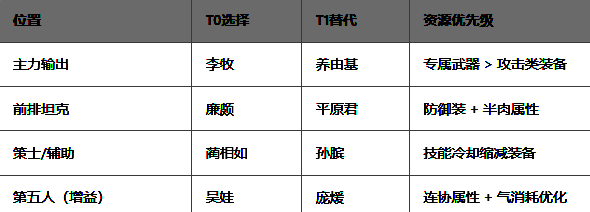 蔺相如用于压制敌方增益技能(如白起减伤),确保李牧输出环境。
