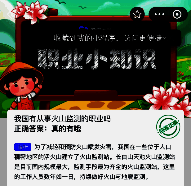 我国有从事火山监测的职业吗?这是支付宝蚂蚁新村2025年6月16日题目,每天在蚂蚁新村答题,不仅能学到有趣的职业小知识,还能提高木兰币的产速,帮助小镇建设。今天正确答案是【真的有哦】。我国有从事火山监测的职业。为了提前预知火山活动,尽可能降低灾害损失,我国设立了专门从事火山监测的职业。这些专业人员肩负着守护生命和环境的重任,时刻关注着火山的一举一动。