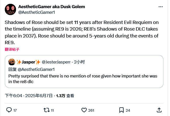 在社交媒体上,有玩家问到,考虑到《生化危机8》DLC中萝丝(Rose)太重要,为什么在9代游戏中却提都不提?