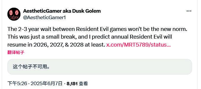 隔2-3年才能有《生化危机》新作,这并不会成为常态,Dusk Golem推测Capcom将从2026年开始,未来三年每年都会有新的《生化危机》游戏发售。