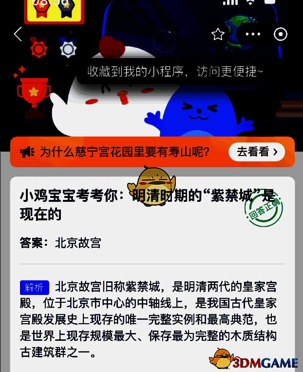 小鸡宝宝考考你:明清时期的“紫禁城”是现在的?这是支付宝蚂蚁庄园小鸡答题6月16日题目,支付宝小鸡答题是大家非常喜欢的活动,大家获取饲料就可以喂养小鸡领取更多的蛋去帮助更多的人了!今日正确答案是【北京故宫】,紫禁城是明清两代的皇家宫殿,始建于明成祖永乐年间,现称为北京故宫博物院。