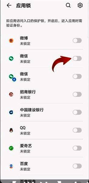 3、再设置应用锁验证密码,也可以关联指纹或人脸识别,设置完成后将【微信】右侧的开关打开,此时返回微信页面,就需要输入密码了。