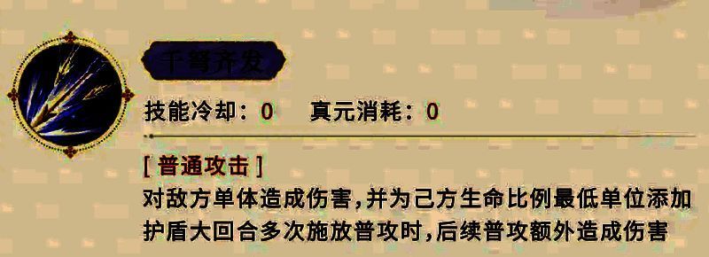 蒙恬的普攻“千弩齐发”虽为基础技能,但具有明显的战略价值。每次攻击不仅能对敌方单体造成伤害,还能为我方生命值最低的单位施加护盾。更重要的是,当在同一大回合内多次触发普攻时,其后续攻击的伤害会逐次提升。这意味着在连动技能或被动机制支持下,蒙恬的普攻能在对抗中后期打出可观的累计伤害。