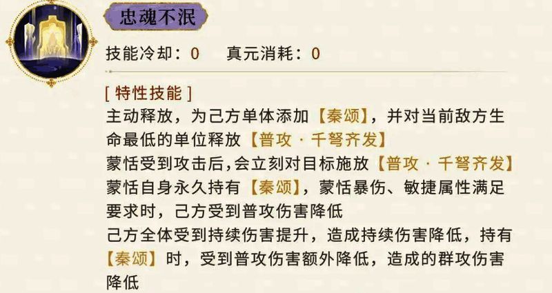 他的特性技能“忠魂不泯”是整套机制的核心。该技能不仅能主动为我方单位赋予“秦颂”状态,还能触发一次对敌方生命最低单位的普攻。当蒙恬受到攻击时,也会立即对目标发动一次普通攻击,使其具备一定的反击能力。此外,蒙恬自身常驻“秦颂”状态,具备较强的缴械免疫和伤害减免效果,使他在多种控制、爆发环境下依然具备稳定发挥空间。