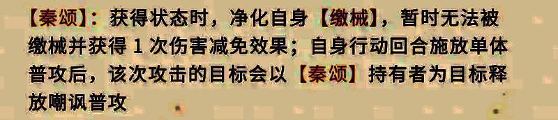 “秦颂”本身为一种多效状态:净化缴械、暂时免疫缴械、获得一次伤害减免,并在回合内使用普攻后使目标强制嘲讽该“秦颂”持有者。这一机制使得蒙恬不仅能在前排承伤,还能有效控制敌方攻击方向,为队伍中脆弱单位提供保护。对于依赖节奏掌控的阵容来说,这种机制尤为关键。