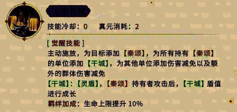 觉醒技能“万里长城”则强化了蒙恬的全局防御能力。技能释放后,不仅能为目标添加“秦颂”,还会使所有持有“秦颂”的单位获得“干城”状态,同时为其他队友提供群体减伤。值得一提的是,“干城”是一种具备成长机制的护盾,每次攻击后盾值会提升,使得阵容在战斗持续时间越长的情况下越趋于稳固。