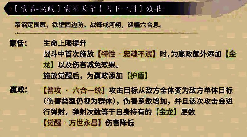 蒙恬的羁绊机制也极具战略深度。与赢政搭配时,首次使用“忠魂不泯”可为赢政添加“金龙”与伤害减免,且在释放觉醒技能时再为其附加护盾。而赢政普攻将由群体转为单体弹射型,并随“金龙”层数提升弹射次数,攻击力更集中,节奏也更加灵活。此类搭配适用于精准打击敌方核心的队伍。