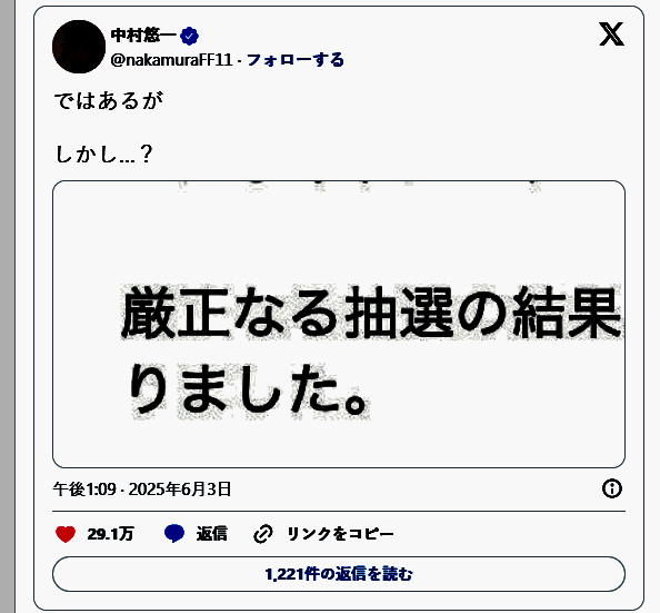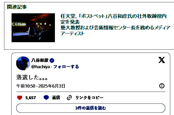 ·任天堂在5月初认命了八谷和彦为任天堂非社内任职董事,其影响力可见一斑,然而另众多网友没想到的是他居然也没中签。