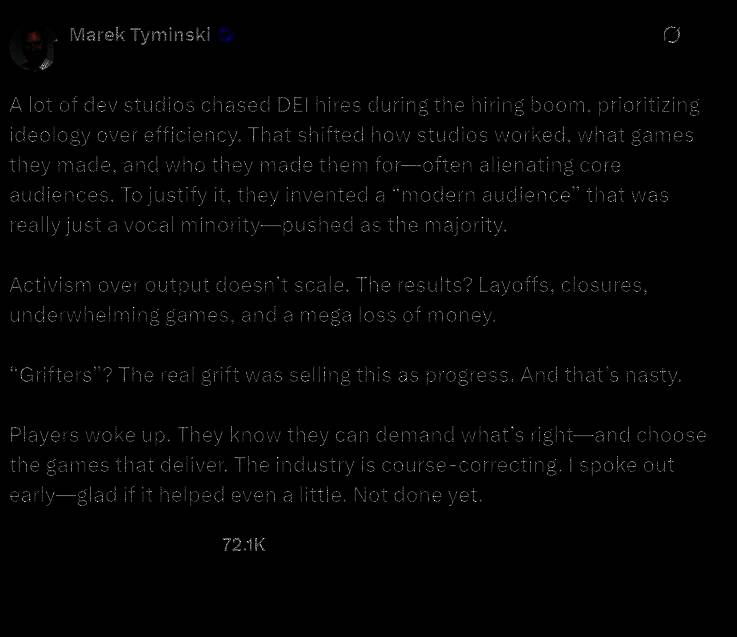 Tyminski称他对于自己能在早期公开发声感到欣慰,并会继续坚持立场。他强调《光与影:33号远征队》《堕落之主》等游戏的成功证明,制作一款优质游戏无需依赖DEI包装。