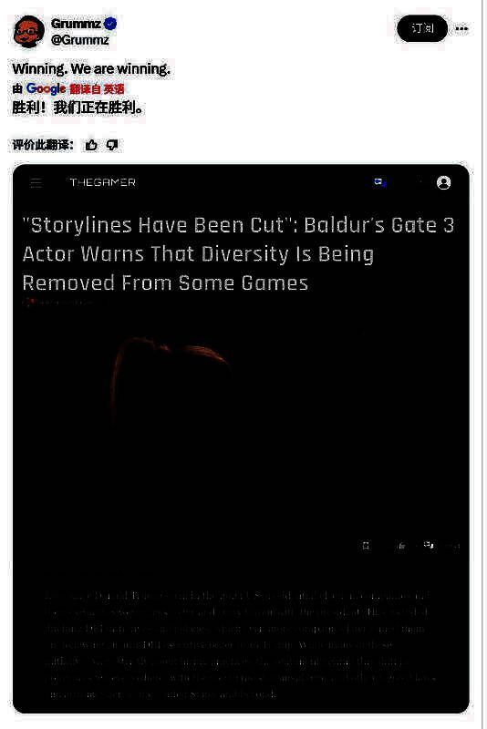 《博德之门3》的配音演员也谈到了游戏中的DEI问题,称现在的开发商在涉及多样性内容时开始进行“自我审查”。