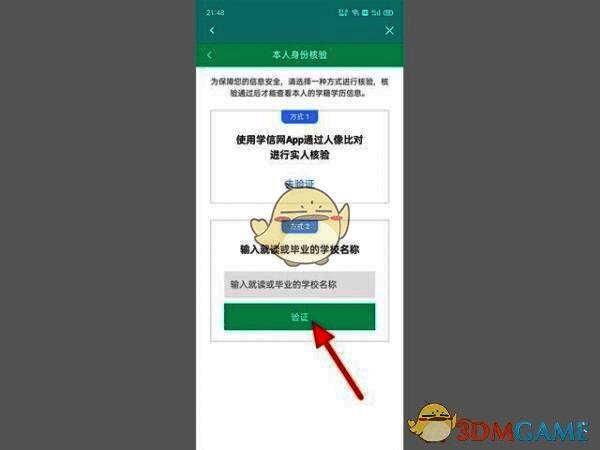 3、在本人身份核验界面,完成身份验证,以学校名称为例,输入【校名】,单击【验证】。