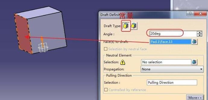 随后弹出拔模角度定义窗口,在拔模类型中选择第一个,也就是常量模式,在拔模角度输入需要拔模的角度大小,这里输入20deg, 在需要拔模的面中选择前表面。