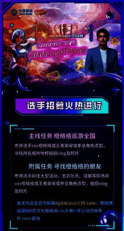 除了精彩的电竞比赛,同期举办的2024动感次元橙络络cosplay大赛同样备受瞩目。这场大赛覆盖全国10余省,将持续3个月。在此期间,参赛选手可cos橙络络、王者荣耀角色或拳皇形象,寻找所在城市地标拍摄vlog及照片并将作品发送至官方邮箱,同时在社交媒体上带话题#动感地带橙络络cos大赛#并@动感地带M-zone官微,即视为参赛成功。线上海选赛成功晋级者将进入动感地带5G校园先锋赛分省线下赛,最终有机会晋级全国总决赛,成为橙络络官方coser,赢取万元大奖!