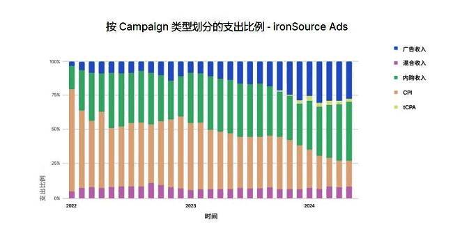 ●广告主正采取更加多样化的用户获取策略。报告数据显示,过去两年,ironSource Ads 和 Unity Ads 上的广告主们已经通过广告收入、内购收入和混合 ROAS 等不同目标导向的优化工具,进一步多样化了广告投放策略,并相应地调整了预算分配。