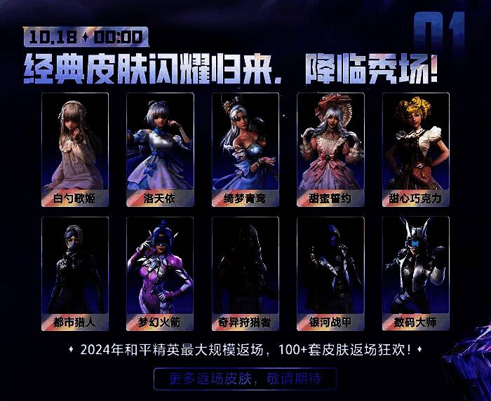 10月18日零点起,《和平精英》将于游戏内开启2024年最大规模的皮肤返场狂欢,共计推出上百套高人气经典皮肤,风格各异、且获取形式多样。既有软萌的“白勺歌姬”、又有融合了中国古典艺术之美的“绮梦青鸾”,此外,如“洛天依”等高度还原的IP合作款,“甜心巧克力”等甜美裙装、“银河战甲”等硬核机甲外观都将一并上线,与各位特种兵再续前缘。