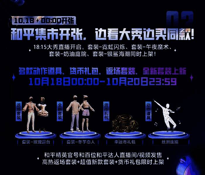 10月18日零点,和平集市开张将正式开张,“霓虹闪烁”“午夜魔术”“奶油庭院”“银鲨海潮”等套装将同时上架,并有丝滑连招动作道具,幸运币货币礼包、玫瑰露台返场套装、冬芋恋人全新套装等高热返场道具和超值新品在《和平精英》官号及百位和平达人的直播间发售,玩家可畅享边看边买新体验。