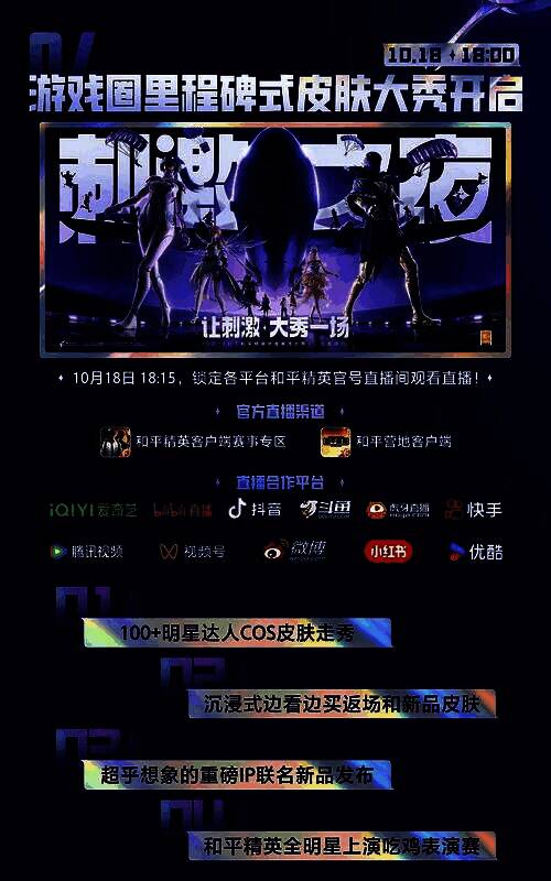 10月18日18:00,“刺激之夜”2024和平精英年度潮流大秀这一游戏圈的里程碑式皮肤大秀将正式开启。秀场之上,玩家可欣赏到上百位明星达人COS的精彩皮肤走秀表演,体验实现沉浸式的“边看边买”。与此同时,《和平精英》全明星吃鸡表演赛也将拉开帷幕。锁定《和平精英》客户端赛事专区、和平营地客户端,或爱奇艺、blibli直播、抖音、斗鱼等多个直播合作平台,即可准时畅享酣畅淋漓的视听盛宴。值得一提的是,还有重磅IP新品联名发布值得期待。