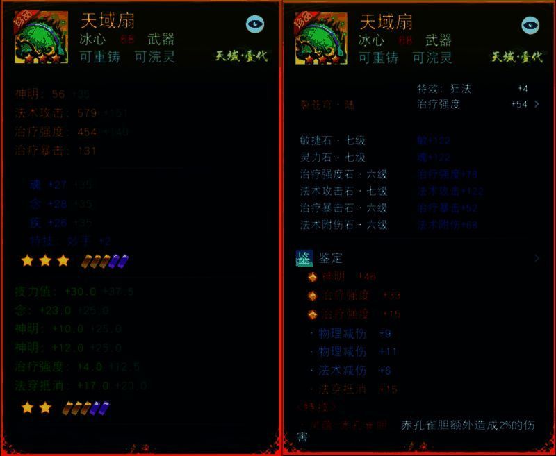 这件68级武器【天域扇】可谓是多边形神器,812.7点治疗强度和244点治疗暴击为团队血量保驾护航,239.5点神明提高会心抵抗率,让少侠面对敌人的攻击更加安心,1036点法攻提供了不俗的输出能力,再有特技【灵蕴-赤孔雀胆】加持,少侠战斗中也能更好地辅助队友完成补刀,有如此神兵相助,少侠定能无往不胜!