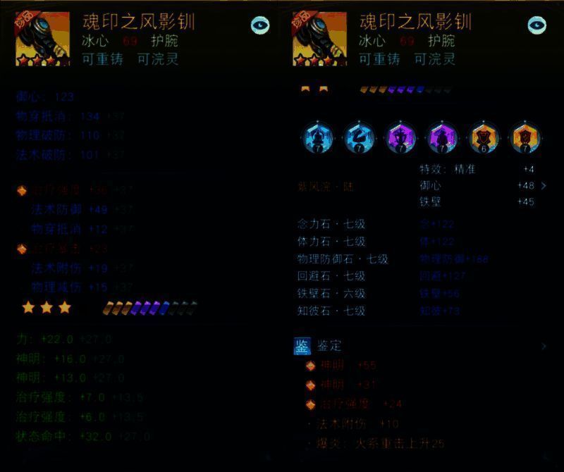 这件69级护腕【魂印之风影钏】同样不容小觑,141.9点治疗强度能迅速疗愈伤痛,610点生命值提高少侠操作容错率,310点物防和220点物穿抵消避免在敌人的猛烈攻势中速融,171点御心、169点神明和101点铁壁给予全方位防护,无论是面对会心流还是重击流对手,少侠都拥有与之一战的底气!