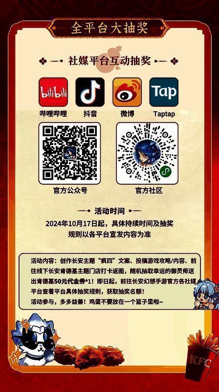 除了以上的游戏内KFC联动活动,还有一系列专属福利和活动,V你50没商量。这一次,长安幻想还准备了许多专属联动福利,让所有御灵师都能享受到联动福利,畅玩长安,同庆美味盛典!