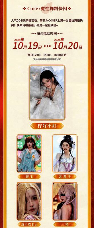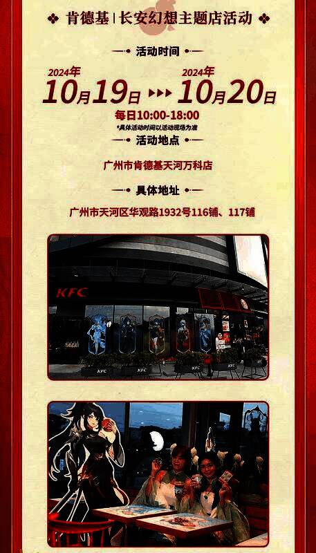 线下主题店快闪活动也准备就绪,美女coser和线下惊喜福利全部安排!2024年10月19日-10月20日,《长安幻想》将在天河万科肯德基主题店举办线下活动。人气COSER「柠好不好」亲临现场,与「狸宝」「莲莲子」「皮卡皮卡云」「三桥」等一众美女COSER上演魔性舞蹈快闪。此外,现场还准备了丰富的福利活动,长安幻想玩家及现场注册的玩家只需要出示区服及昵称信息就能免费获得一份联动套餐「长安幻想御灵能量套餐」,而且加入玩家社群并发布打卡内容就能获得一次转盘抽奖机会,奖品包含精美周边、联动套餐、肯德基代金券等,准备前往的小伙伴千万不要错过啦!