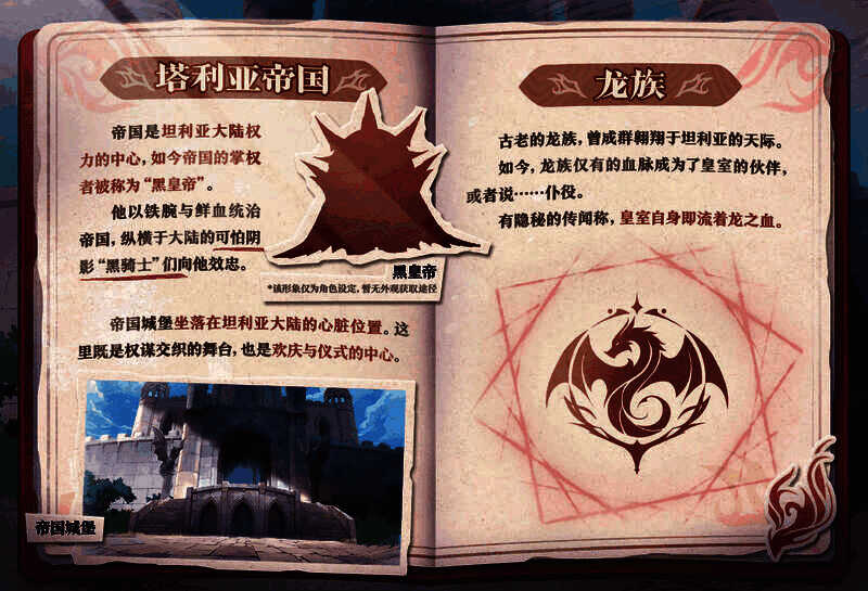 如今帝国的掌权者被称为“黑皇帝”,他以铁腕和鲜血统治帝国,纵横于大陆的可怕阴影“黑骑士”们向他效忠。另有一脉古老的龙族,他们在千百年前曾成群结队翱翔于坦利亚的天际,如今他们成为了皇室的“伙伴”。不过也有隐秘的传闻称,皇室自身即流淌着龙之血。