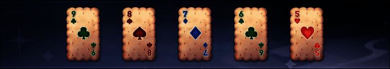 五张饼干牌,按点数依次排列,每一张比前一张大1点,即为五连珠(1点可作为14点使用)