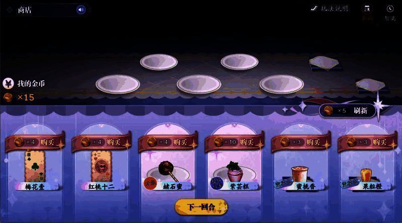 每一回合达成目标积分即可获得金币结算奖励。在下一回合开始前,少侠可使用剩余金币刷新或购买道具以应对接下来的对局。