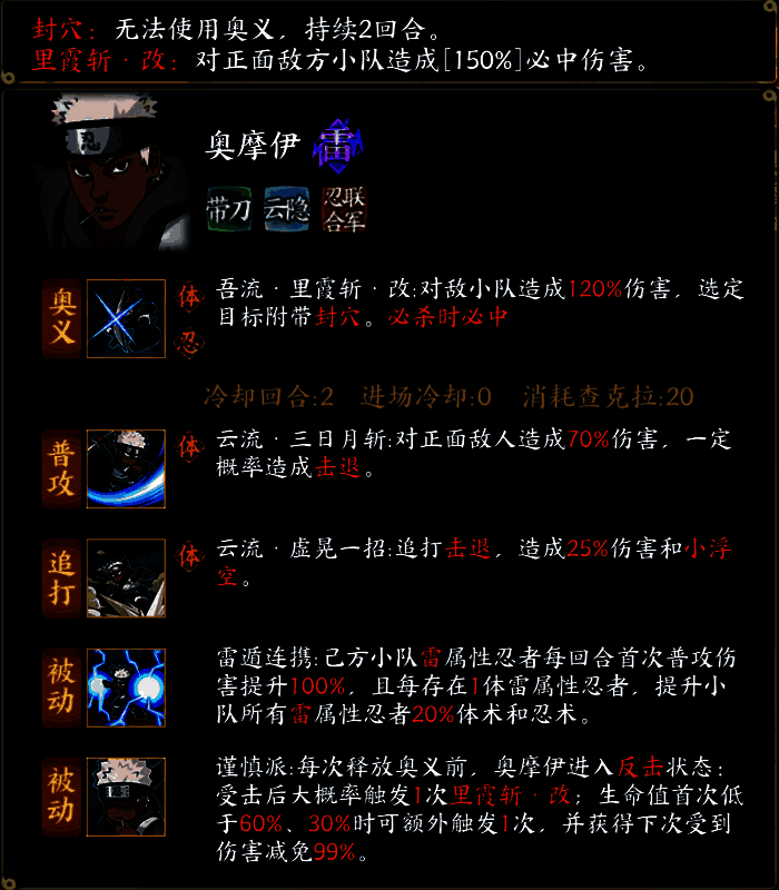 奥义:吾流·里霞斩·改:对敌小队造成120%伤害,选定目标附带封穴。必杀时必中