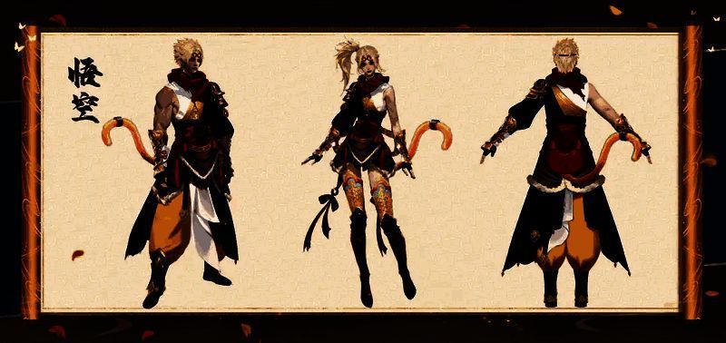 而女角色腰间红色布条及下摆轻垂的挂饰,再搭配上孙悟空经典的虎皮裙,增添了几分俏皮与灵动。下身,腿部护具以金甲点缀其中轻盈而有力,英姿飒爽中又有几份柔美。