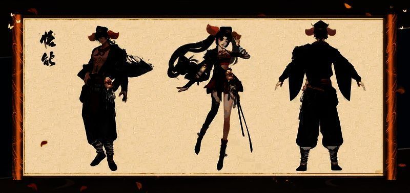 女角色则是一身短打紧身,黑色与暗红交织的衣裙,尽显柔美与力量。肩膀处同样覆盖着刻有花纹的护甲,与男角色相呼应,却又不失温婉,再搭配上那对耳朵更显可爱。