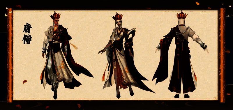 作为西行路上最重要的人物——唐僧,他联动的时装原画处处透露出华丽。男角色袖子上的精致点缀凸显典雅。而白色长袍外一件红色的袈裟轻轻披挂,边缘以金色丝线勾勒,随风轻轻摇曳,更添一份超凡脱俗。