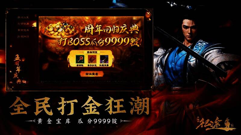 9999锭金子:同时,活动期间,击杀绿品质以上的BOSS还可领取金钥匙和金子红包,金钥匙可用于黄金宝库抽奖,武神精魄、冲穴丹、金子等超多豪礼应有尽有,全民瓜分9999锭大额金子!