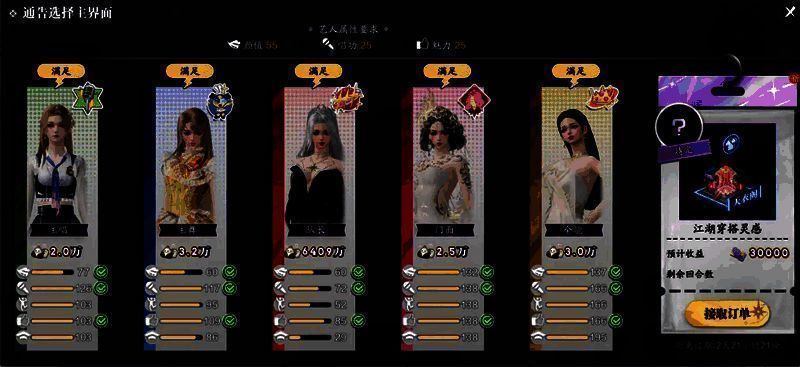 通告多多,收益多多。天衣阁、曼声乐坊、文玉心影、绝智轩、灵琳阁分别向旗下艺人抛来橄榄枝,选择适合的艺人签约获取收益吧!