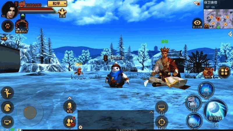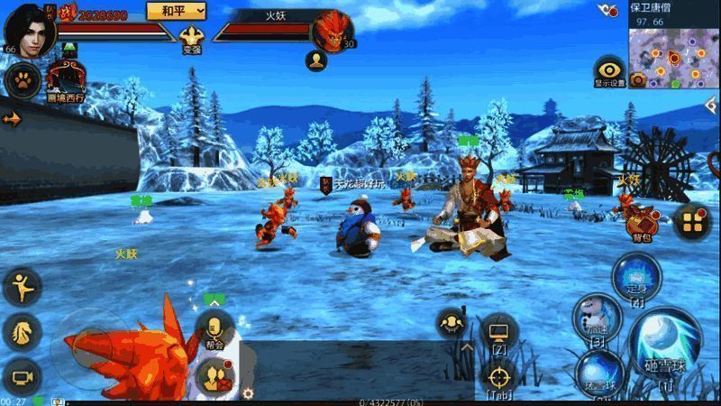 游戏开始后,少侠将化身为雪人,拥有雪人的专用技能。在此期间,少侠需使用技能击败周围出现的火妖,保护唐僧。唐僧死亡则挑战失败,需重新进行挑战。