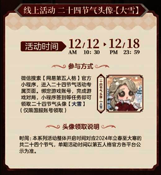 随着大雪线下活动的完美落幕,线上活动也在等待各位访客参与。大雪线上活动(12月12日至12月18日)将于【网易第五人格】官方小程序二十四节气活动专属页面内开展,访客们在完成绑定游戏账号、完成游戏对局、小程序签到等任务后即可领取二十四节气头像-【大雪】。画面中,作曲家身穿红色外套,在银装素裹的林间悠然散步,雪花在他身上静静飘落,一切都显得静谧美好。
