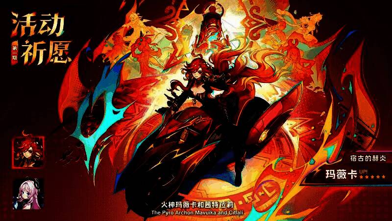 在5.3版本第一期角色活动祈愿中,游戏内将同时开放角色活动祈愿「宿古的赫炎」与角色活动祈愿「星边夜语」。全新限定五星角色「焚夜以炎·玛薇卡(火)」将出现在角色活动祈愿「宿古的赫炎」中,「白星黑曜·茜特菈莉(冰)」则将出现在角色活动祈愿「星边夜语」中。