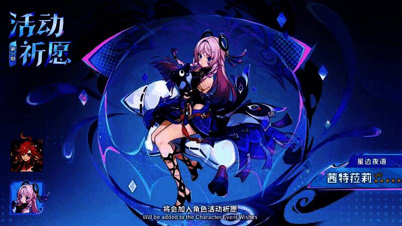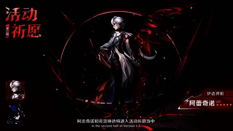 在版本第二期角色活动祈愿中,角色活动祈愿「炉边烬影」将会开启,限定五星角色「孤暝厄月·阿蕾奇诺(火)」将迎来概率UP,而限定五星角色「秉烛狝影·克洛琳德(雷)」则在角色活动祈愿「流霆贯夜」中迎来返场。全新四星角色「翦玉编春·蓝砚(风)」将出现在角色活动祈愿「炉边烬影」、「流霆贯夜」中,获取概率大幅提升。