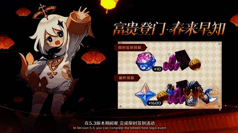 5.3版本中,旅行者完成限时签到活动,可以领取总计10枚纠缠之缘。同时在今年的海灯节答谢邮件里,除了会送出1600原石,还将包含智识之冕、祝圣之霜在内的稀有养成资源。另外Xbox平台的风之翼也会在5.3版本期间,通过邮件限时发放给所有旅行者。